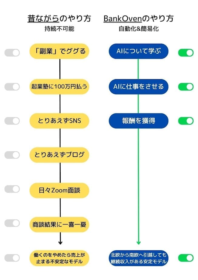 さて、こんな夢みたいな生活を可能にしたのが、AIを活用したビジネスの自動化です。以前は高額な教材しか提供できませんでしたが、AIの登場で状況は一変。より安価で、より多くの価値を届けられるようになりました。