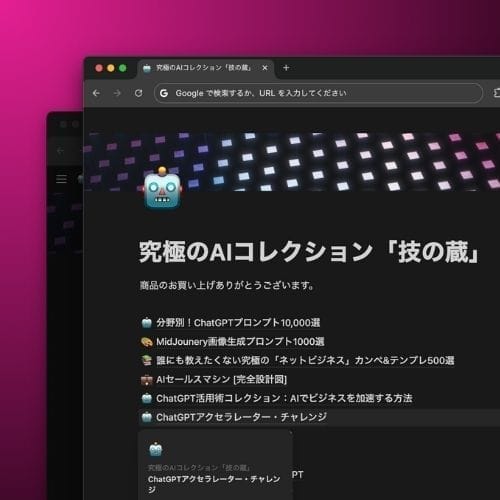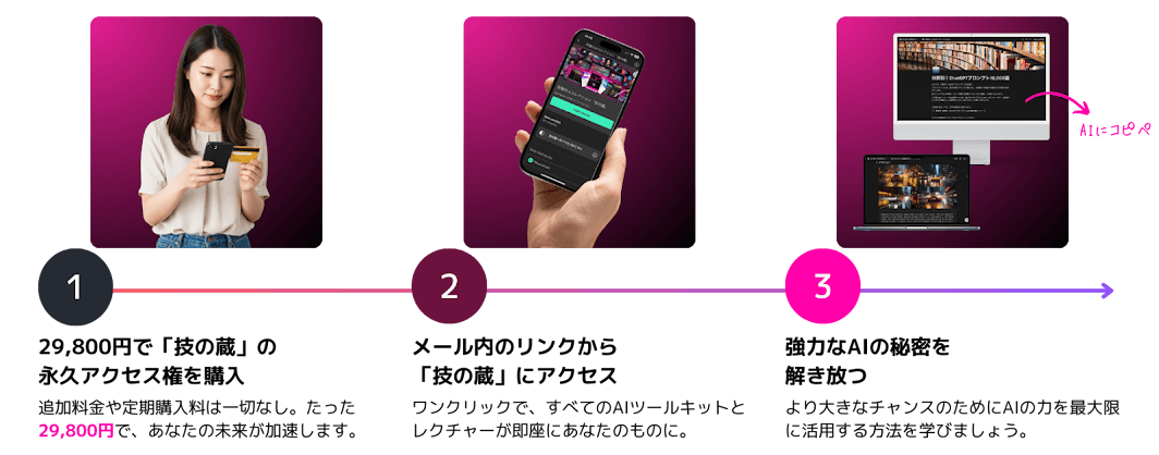 注文完了後、AIアルティメットコレクション「技の蔵」の全資料への即時アクセス権が記載されたメールが届きますので、すぐに始められます!