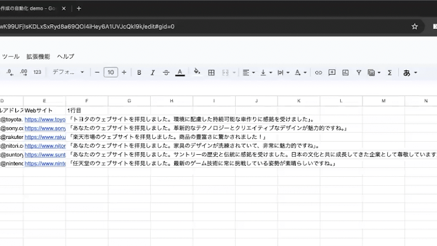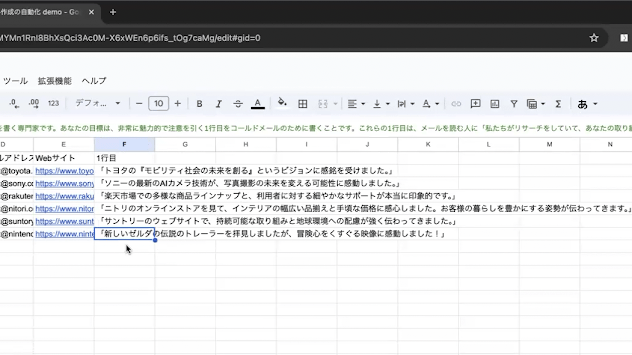 ➜ ChatGPTとGoogleスプレッドシートを連携させた営業メール自動生成システムの構築方法(見込み客情報を入力するだけで、パーソナライズされた営業メールを数分で作成)