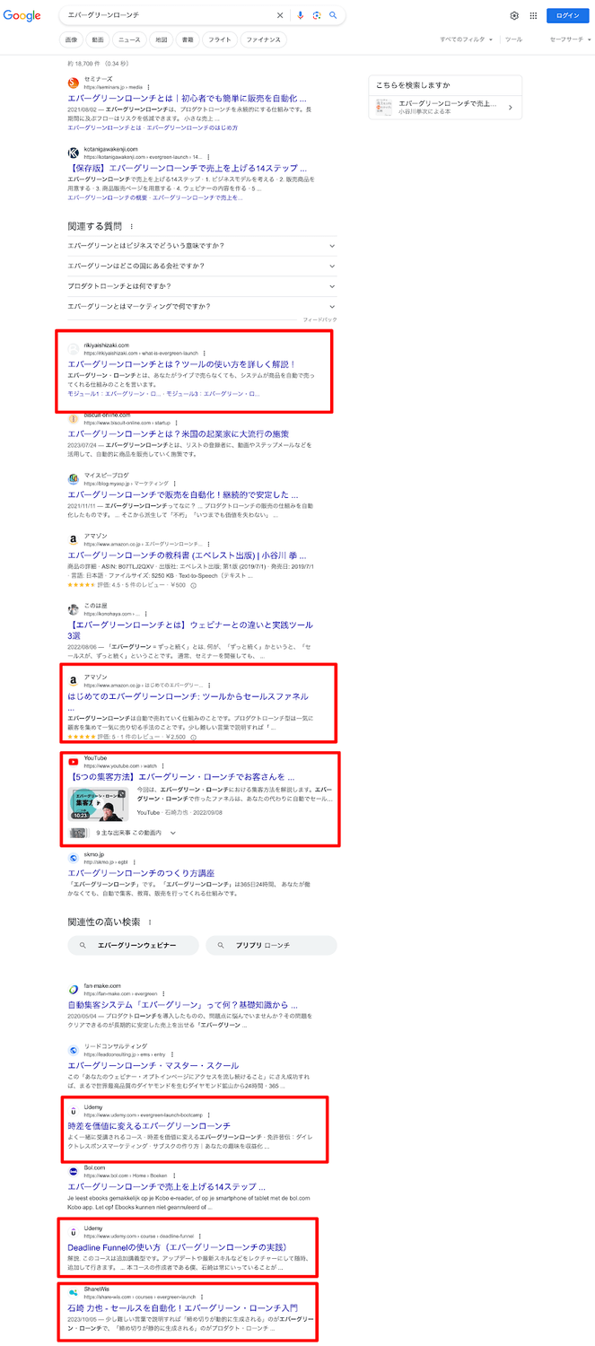 具体的には関連キーワードでググった時に検索結果の一ページ目にあなたのYouTube動画がトップに表示され、Amazonで販売しているあなたが著者のKindle本とAudibleのオーディオブック、さらにはブログ記事とUdemyのコースが検索結果に並びます。