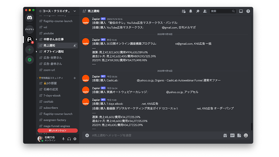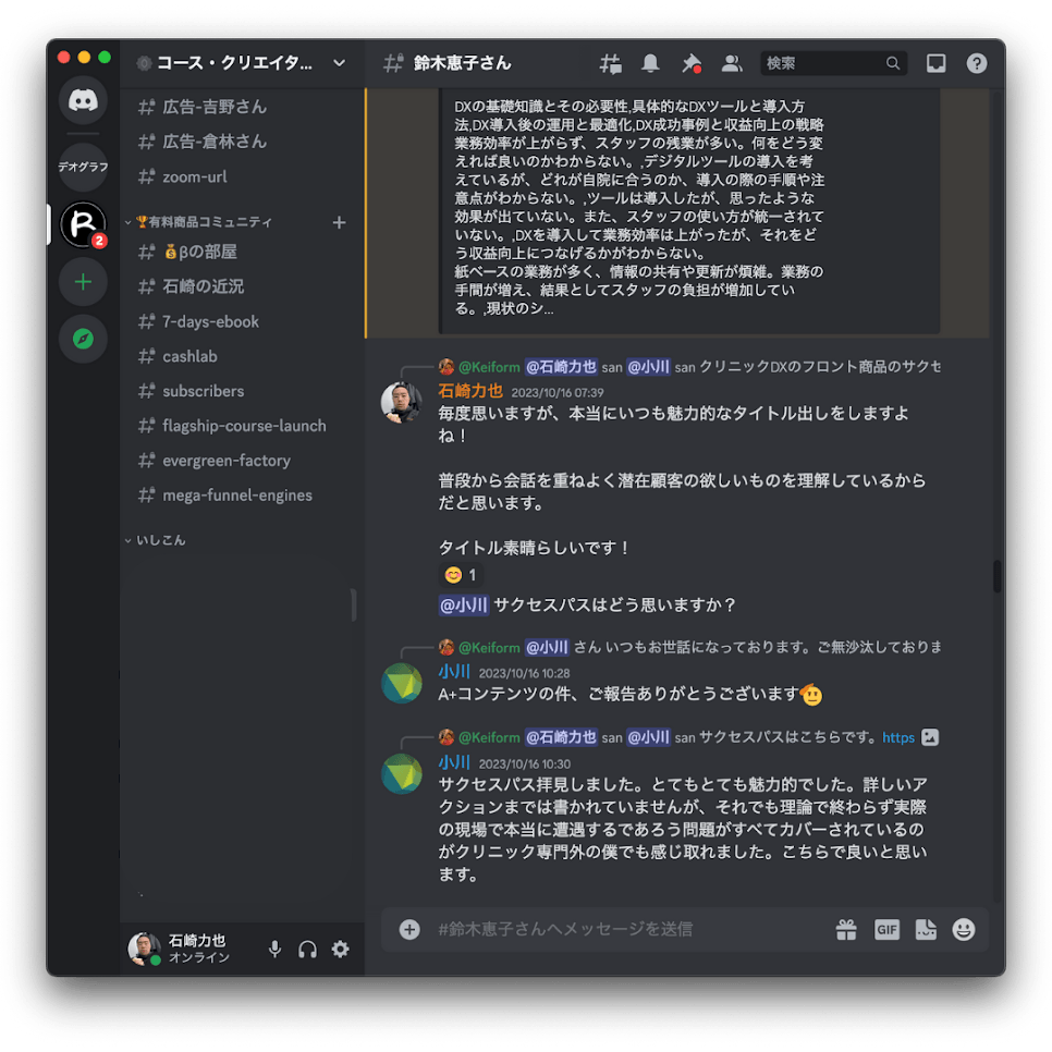 3年前に石崎さんのOSBに参加させてもらって、自動収益のTeachableを組み上げて、その後いしこんにも参加させてもらいすごく売上が良くなりました。