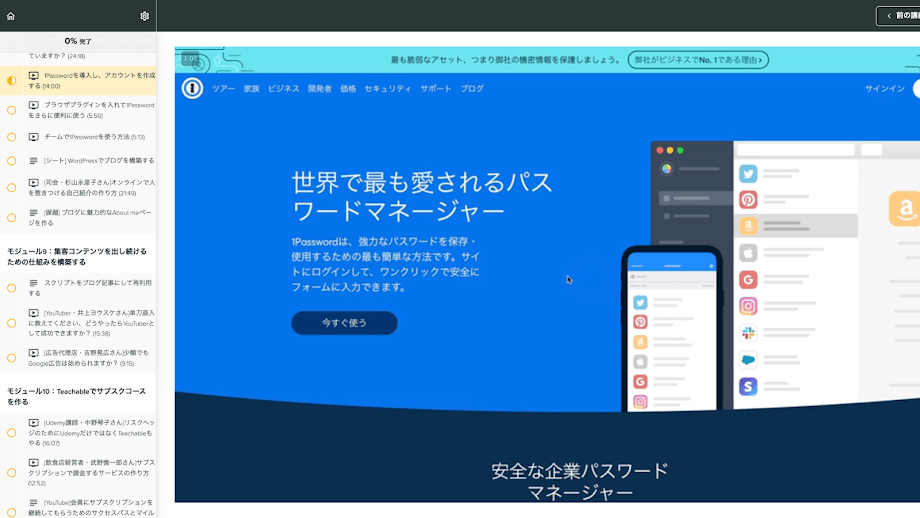 ワンステップづつ進み、テンポよく進む。オンラインコースをコツコツと作りたい方に向いている。一つの動画が短く、ワークシートがあるので作業がしやすい。 実際に売り上げを上げている人の話が聞けるので実感しやすい。