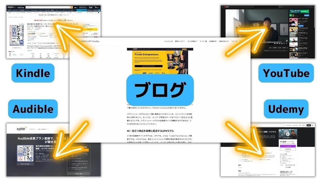 Blog→YouTube→Udemy→Kindle→Audible...と元は1つネタを循環させることで集客効率を上げる。