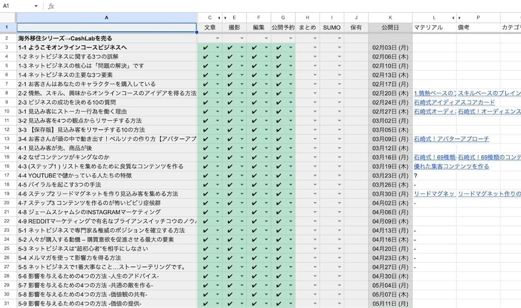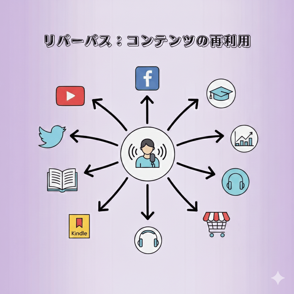 オーガニックトラフィックの肝はリパーパスです。僕たちが世の中に公開している様々なコンテンツ・フォーマット(ブログ記事・YouTube動画・Udemyコース・Audible音声・Amazon Kindle・ポッドキャスト・メルマガ)は一見するとバラバラに制作されているように見えますが、実際は管理シートに基づいて計画的に公開されています。