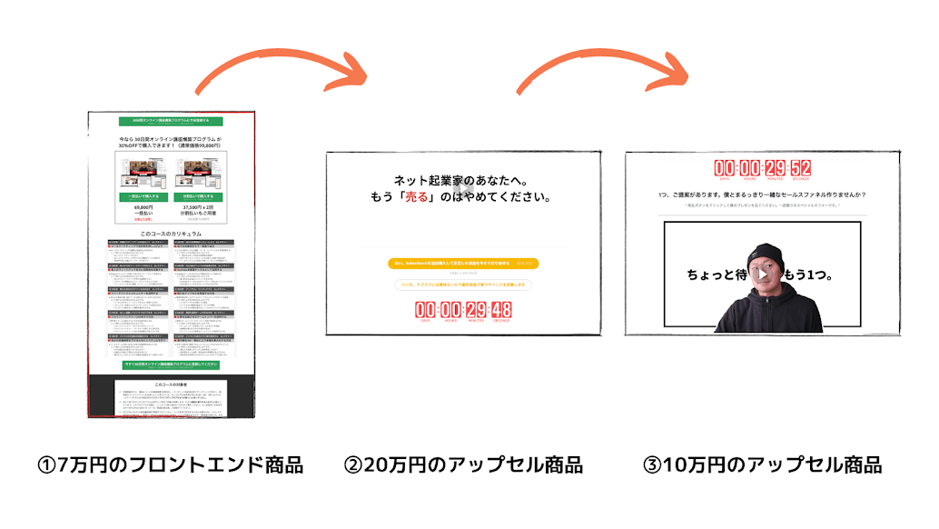 7万円の商品を買った直後に20万円と10万円の商品を追加で購入する人なんているんだろうか?とあなたは疑問に思うかもしれません。アップセル商品は売れます。7万円のフロントエンド商品を1つ売るだけのセールスファネルに比べて、20万円と10万円のアップセル商品を追加で2つオファーするセールスファネルは合計で2倍以上の売上を叩き出します。