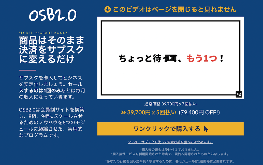 アップセル商品をワンクリックで決済させる手法をワンクリックオファーとかOTO(ワンタイムオファー)とか言ったりします。僕たちが動画の中でオー・ティー・オーと言った時、それはワンクリックで購入できるアップセルオファーのことなんだなって理解してください。