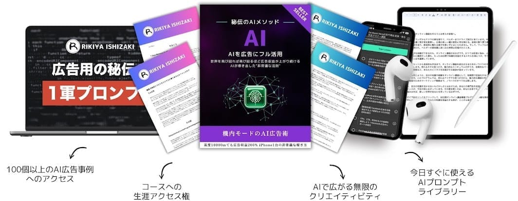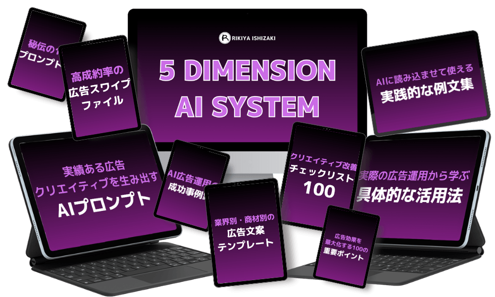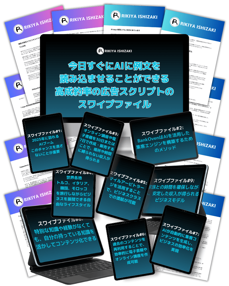 このスワイプファイル集は、僕(石崎力也)が3年で1.5億円を生み出した現役の広告から抽出したものです。今この瞬間も僕の広告で使われ続け、高い成約率を叩き出している実践的なテンプレートばかり。あなたもこれらを活用することで、AIツールを最大限活用した効率的な広告運用と安定した成約を実現できます。