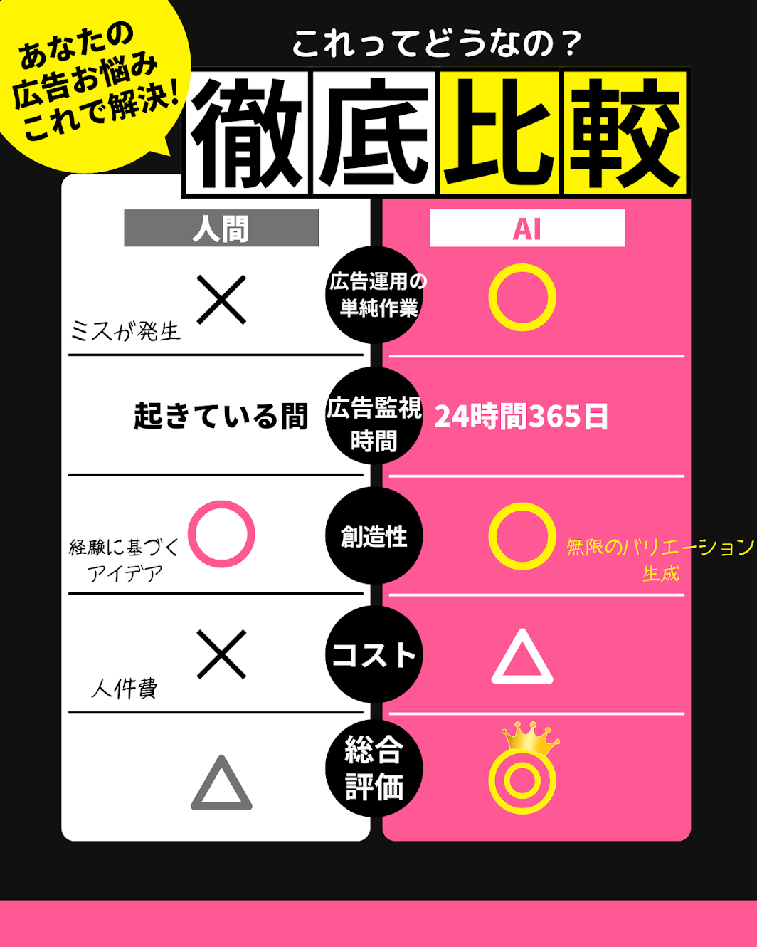 AIをマスターすることで、広告制作の自動化、革新的なアイデア生成、データに基づく意思決定が可能になります。これにより、広告運用のあらゆる面で圧倒的な優位性を確保できます。
