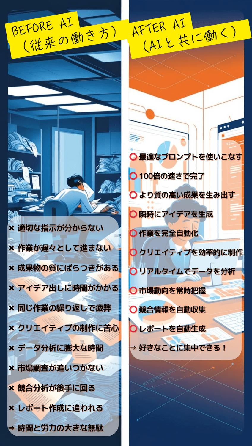 もう迷う時間はありません。AIはすべての業界で革命を起こしています。今、このスキルを身につけた人だけが、確実に成功をつかむことができるのです。